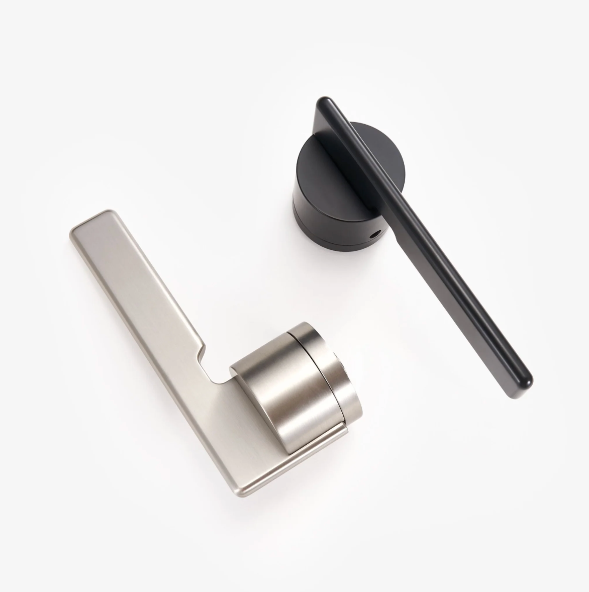 This Modern door handles are perfect for adding a stylish, art-deco touch to any home. Handmade with solid brass and anti-oxidisation properties, these lever handles come in three signature finishes - matte black, satin brass, and satin nickel - so you can easily find a handle to suit your individual style. The lever handle comes as a front and back set, designed to be fitted to internal doors. Available with a matching knurled texture thumb turn privacy lockset or passage setting.