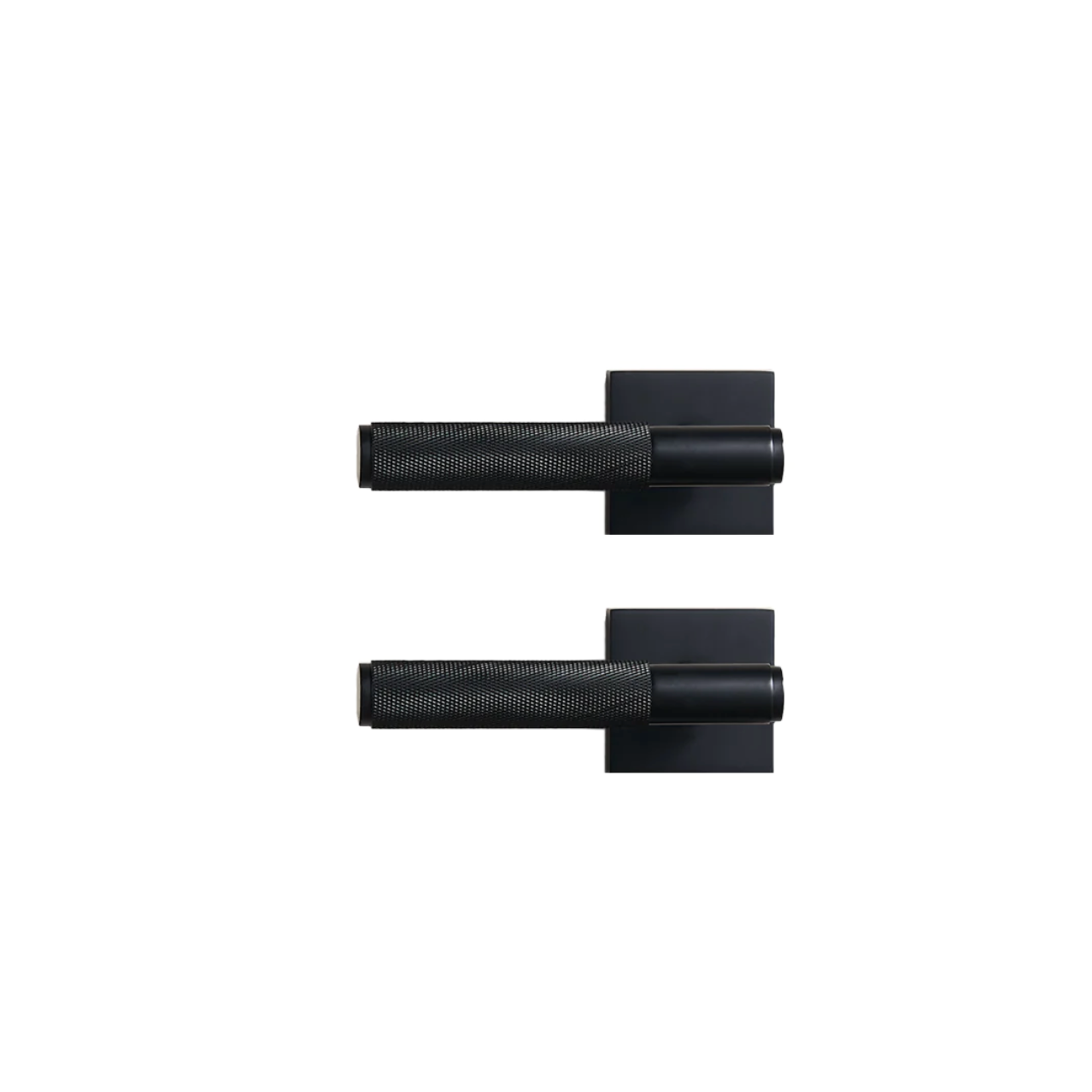This Matte Black Brass Cross Knurled Door Lever Handle is a sleek and modern solution for interior doors. Featuring a cross knurled texture and solid brass construction. Get a door handle that looks as good as it functions. The lever handle comes as a front and back set, designed to be fitted to internal doors. This variant features a square-shaped rose for some extra charisma.Available with a matching cross knurled texture thumb turn privacy lockset or passage setting.