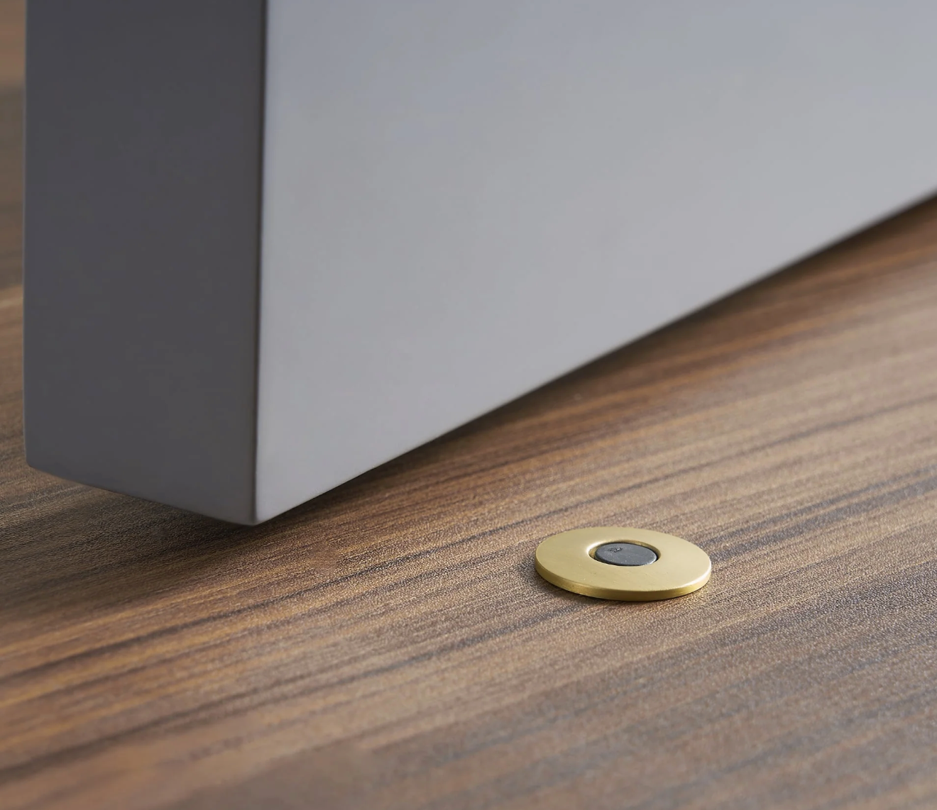 The magnetic brass door stop is completely flush and concealed, giving your home or office space a minimal and high tech feel. Unlike all conventional door stops, this stopper is designed to sit flush against the floor, minimizing trip hazards whilst being extremely functional. The magnet is only activated when the door is above the stop, pulling the floor pin up and stopping the door. Prevent door slamming, damage to walls and hold doors open. Install on all flooring: wood, carpets and tile floors. Available in three finishes.